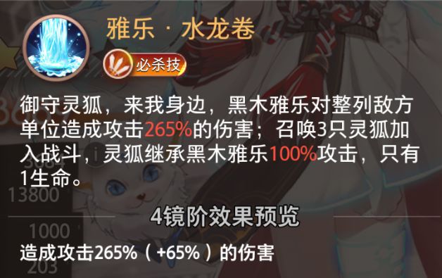 御守灵狐,来我身边,黑木雅乐对整列敌方单位造成攻击265%的伤害;召唤3只灵狐加入战斗,灵狐继承黑木雅乐100%攻击,只有1生命。