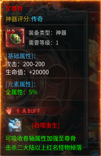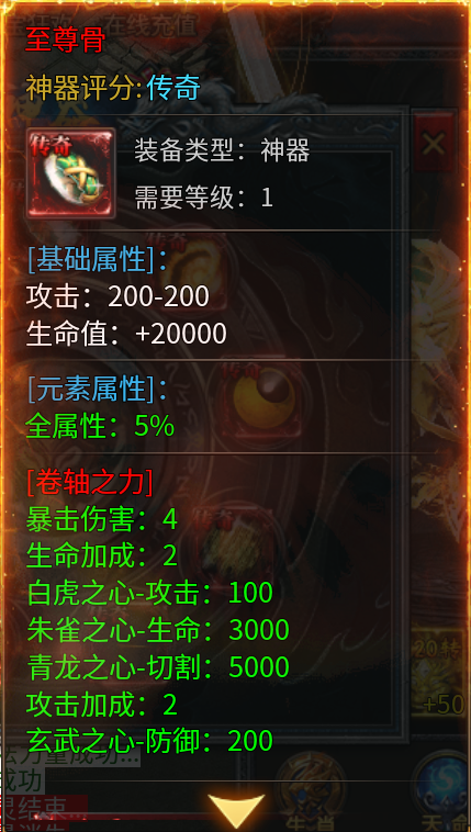 玩法介绍:获取神器【至尊骨】后可吸收专属卷轴强化属性,卷轴共有14种,每种可为【至尊骨】提供1次强化,强化时有成功概率