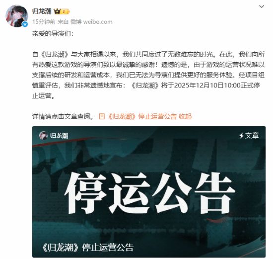 2025 年 9 月 10 日,国风二次元动作游戏《归龙潮》正式发布停运公告,确定将于 2025 年 12 月 10 日 10:00 终止运营,这一消息在游戏圈引发了广泛关注和讨论。