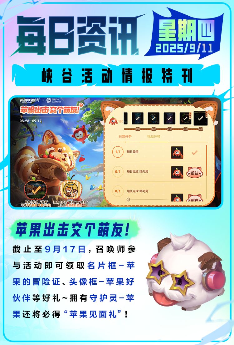 奖励:名片框-苹果的冒险证,头像框-苹果好伙伴等好礼