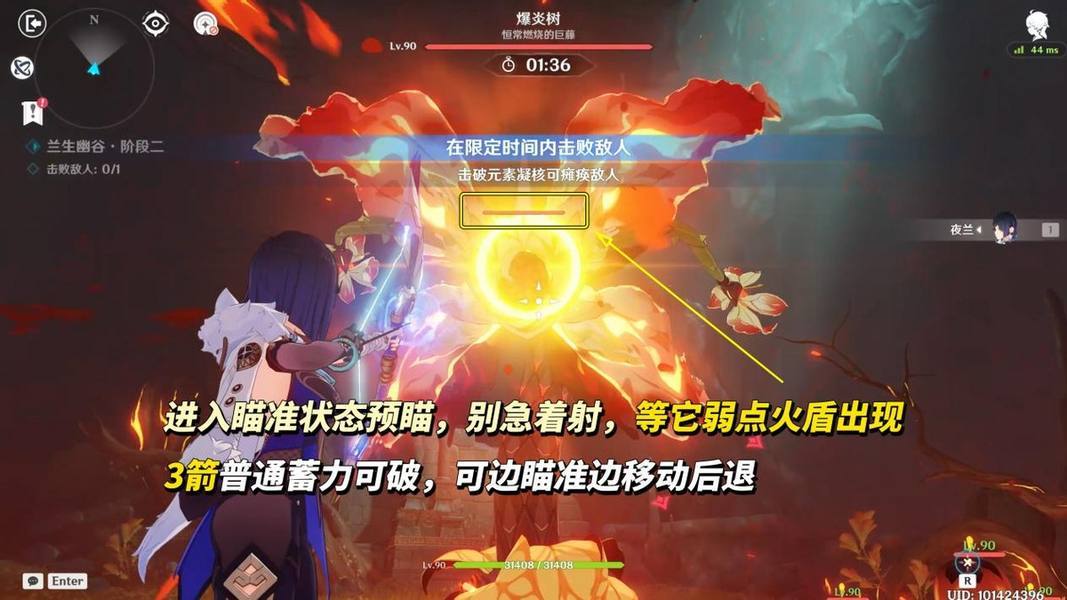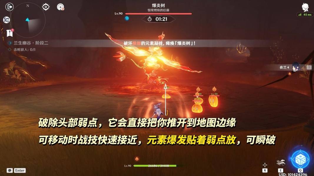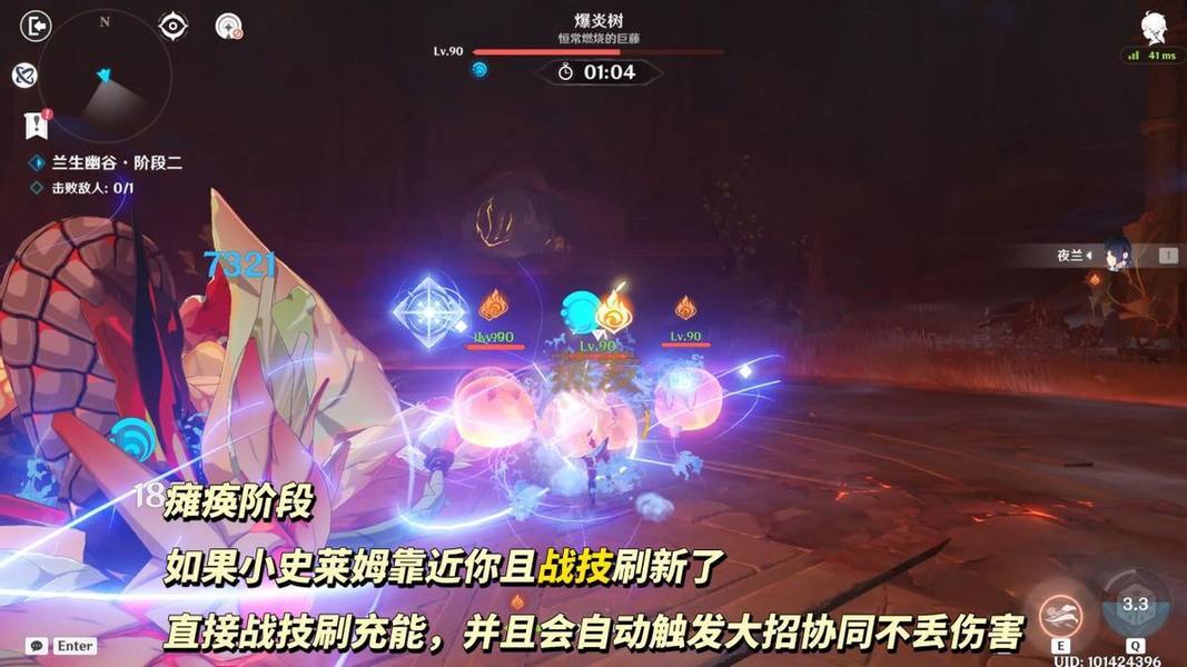 【兰生幽谷·阶段二】考验“普通蓄力挂元素、战技位移贴脸敌人、元素爆发强水与对单输出、大招期间战技命中也会触发协同”。测验方式100秒内击败爆炎树,一般需要让爆炎树瘫痪2、3次,公式化对敌,策略如下: