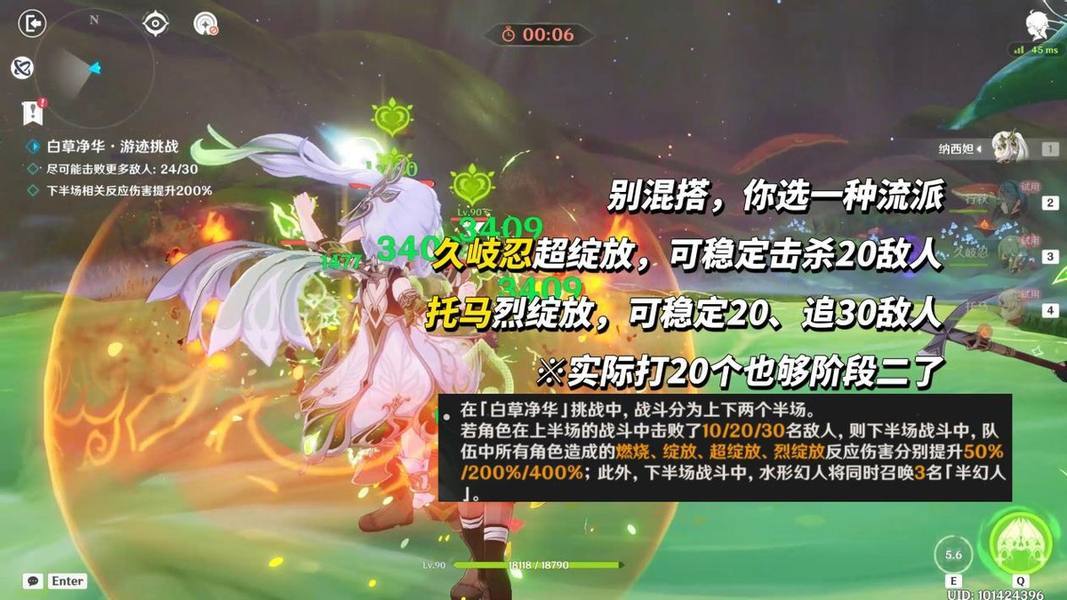 【白草净华·阶段一】考验“绽放流派的选择、纳西妲多波次如何挂草”。队伍内安排的久岐忍与托马需要你二选一,另一个全程不施放技能,否则会触发超载炸飞敌人。并且多波次敌人,不可乱放纳西妲战技,每次都需要用于长按标记敌人。