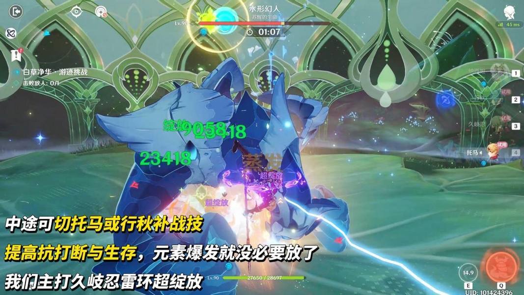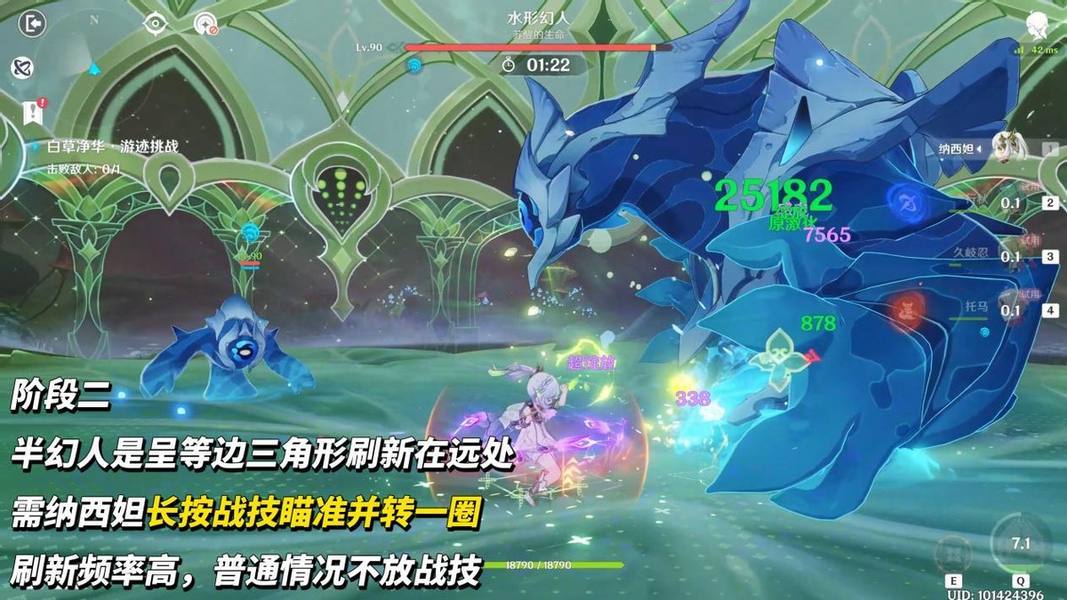 【白草净华·阶段二】考验“战技旋转瞄准标记敌人、队伍抗打断维持、场上精通增幅”。对敌水形幻人,此时对单追踪的超绽放更具优势。纳西妲除了开局战技标记BOSS,后续战技不乱放,只有当场上刷新出半幻人时长按战技转一圈破除,避免BOSS吸收召唤物强化自身。