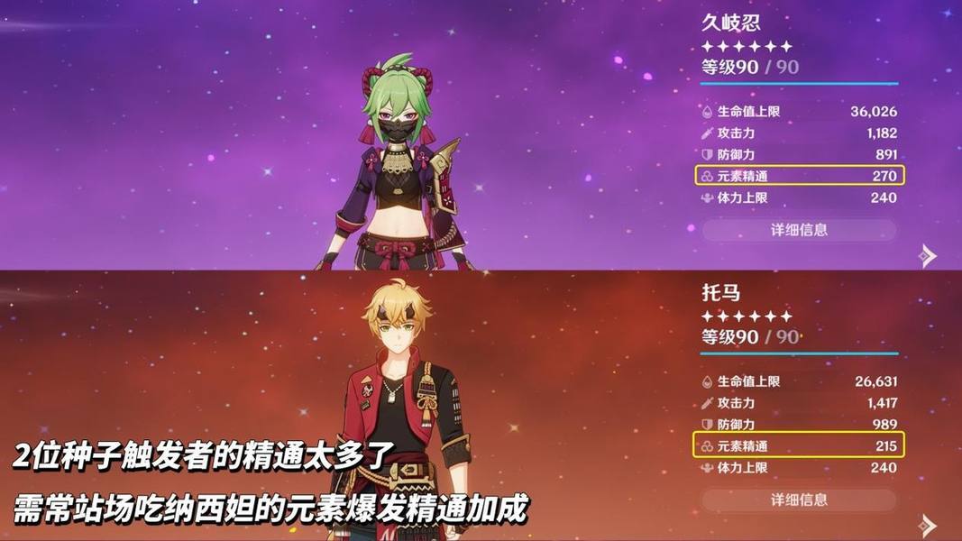 另外多让久岐忍站场吃纳西妲的精通增幅,不然靠试用的200多精通伤害不太够用。