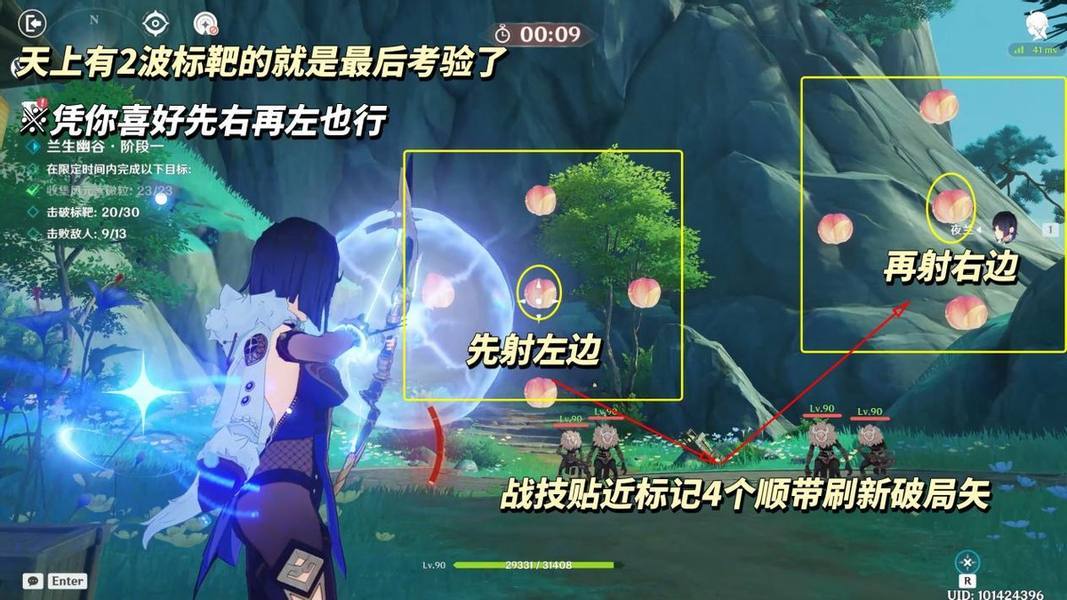 【兰生幽谷·阶段一】考验“夜兰脱战5秒刷新破局矢、战技随标记目标数提高刷新破局矢概率(3个必刷)、破局矢范围爆炸”。关卡道路笔直,需在1分钟内通过并清理途中的标靶与丘丘人。建议移动靠奔跑,战技只用于击杀丘丘人刷新破局矢。