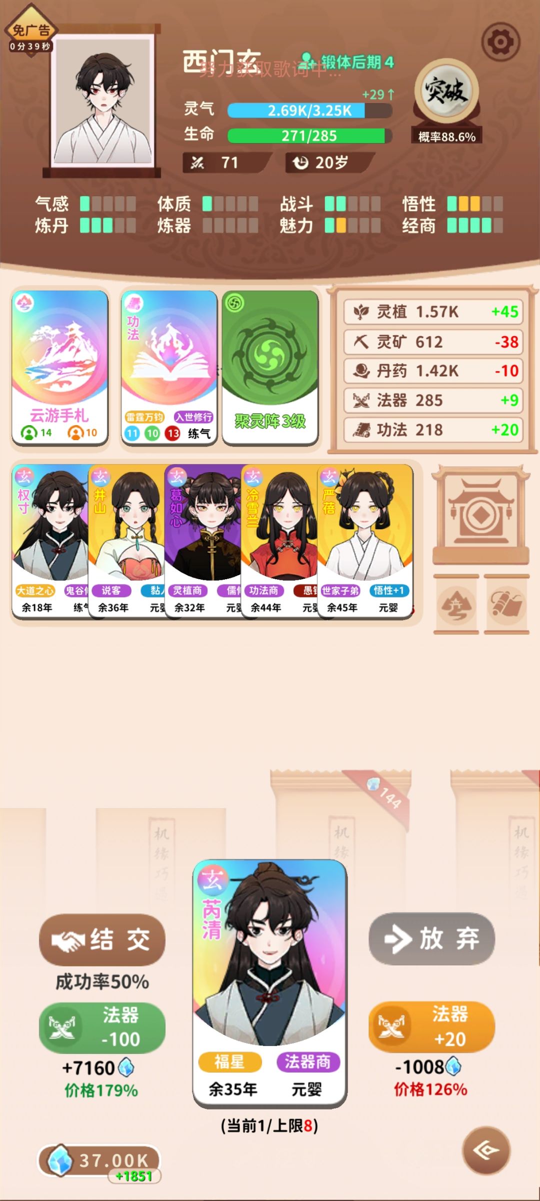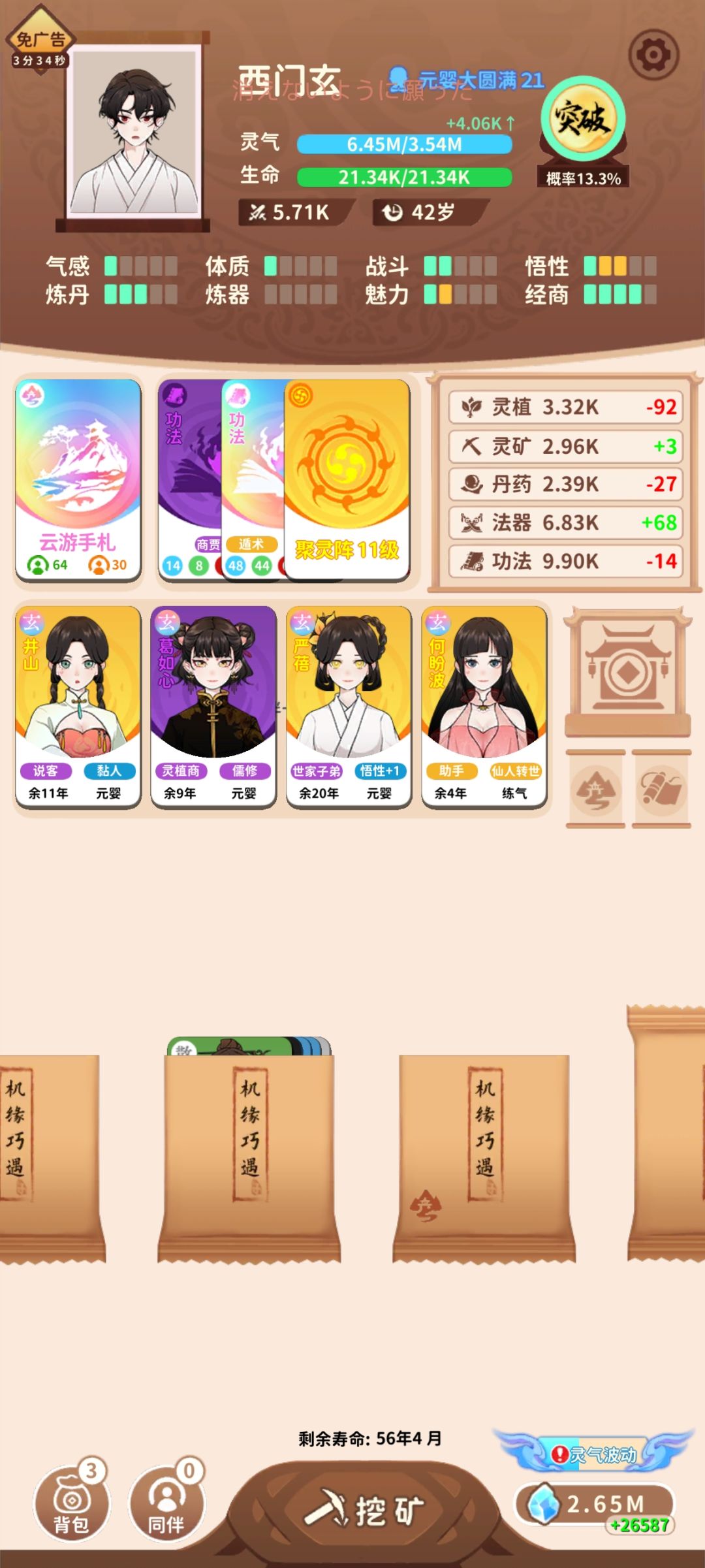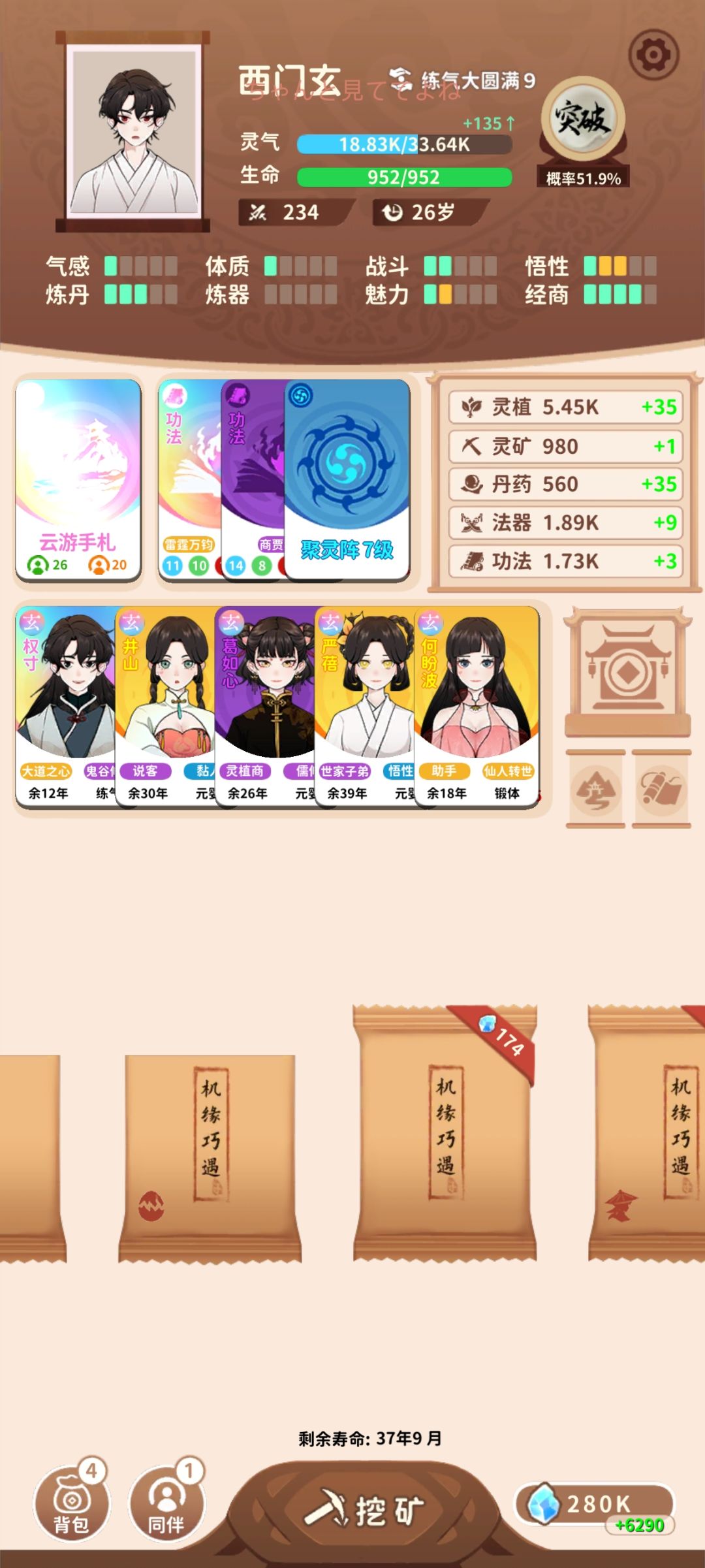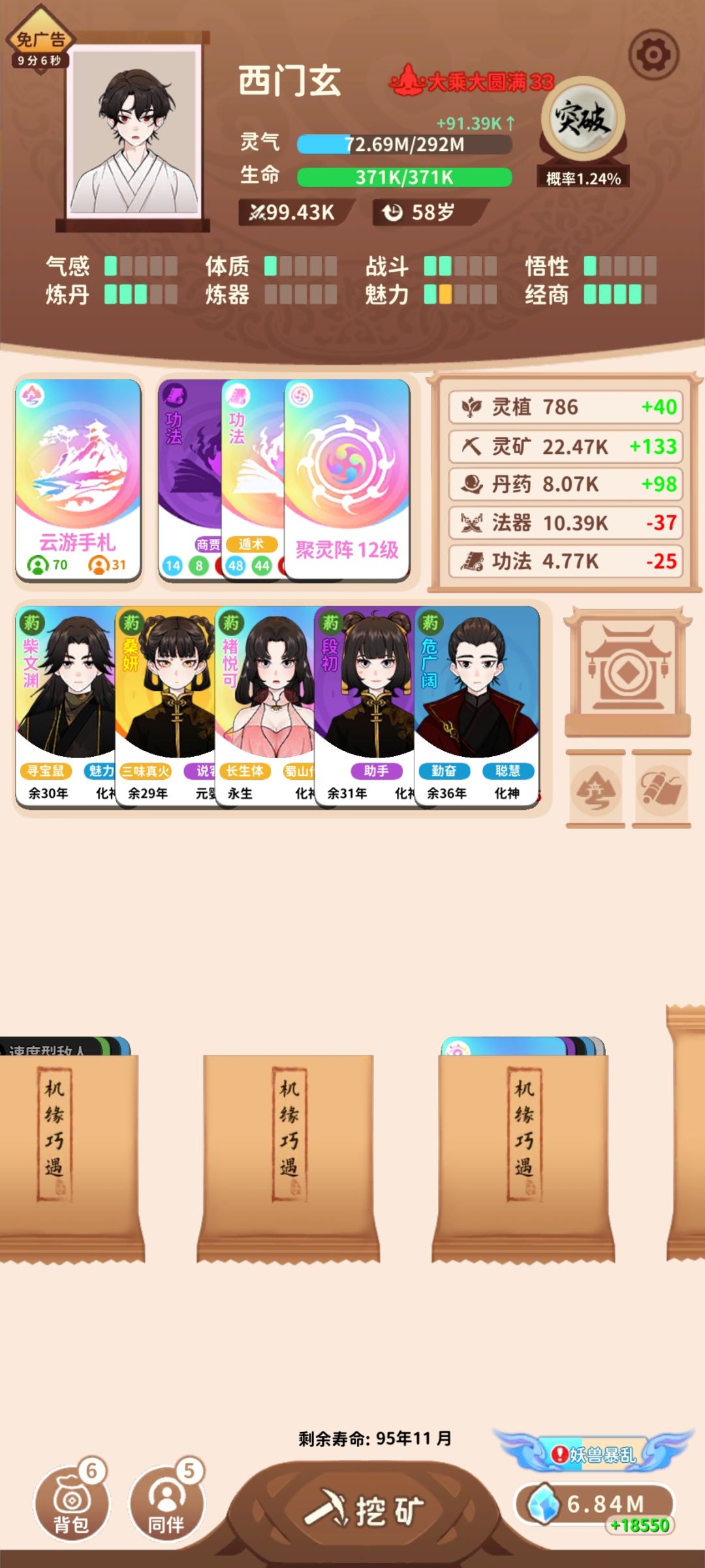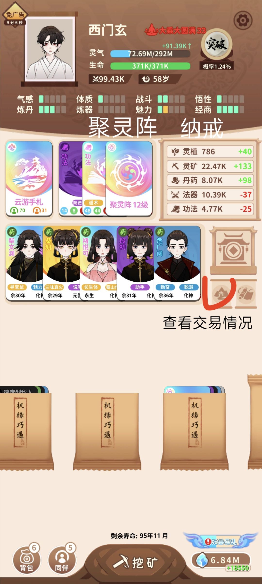 因为钱已经无用,之前的“玄”同伴全部换成对突破有帮助的“药”同伴(提升灵草出现概率)