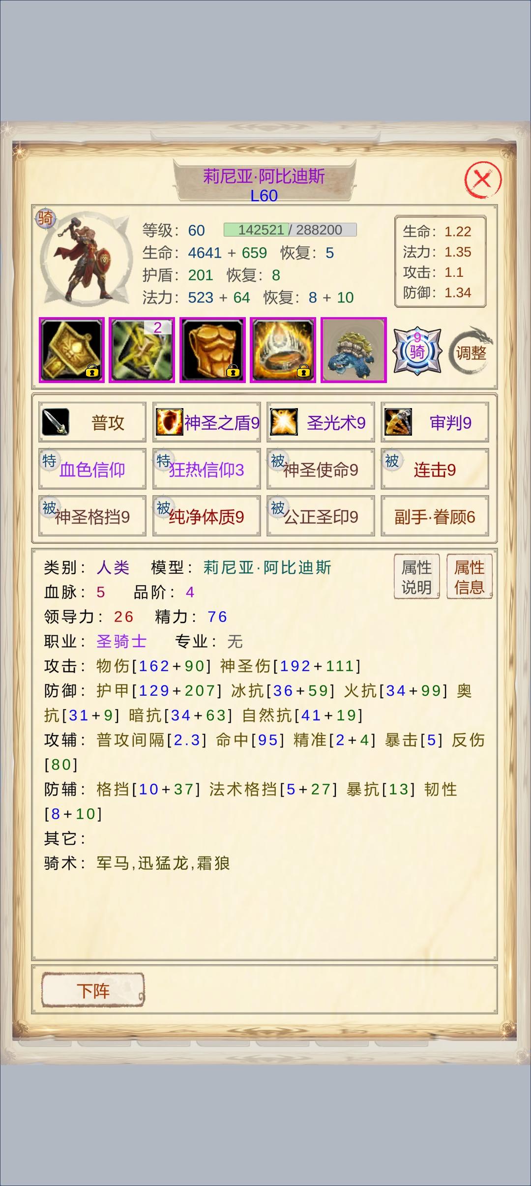- 下图是我通关祖尔格拉布时候的莉尼亚•阿比迪斯(与“阶段7--隐藏佣兵与主角”帖子当中的不一样,我花了较多时间,重新找了一个具有“神圣使命”、“神圣格挡”的莉尼亚·阿比迪斯)