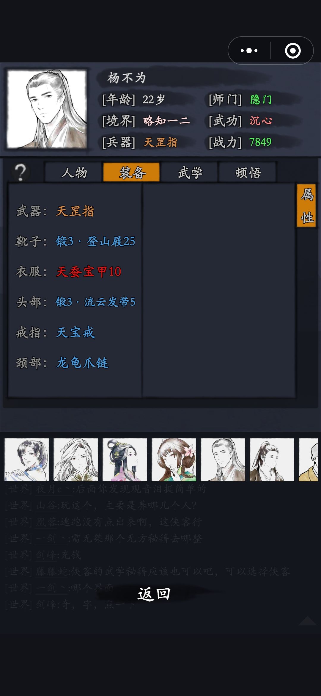 现在矛盾点:雁哨坞全员反伤,海棠鞭一下被反五下,等嘲讽结束对面集体放技能了除了猴棍主就全死。罗冰第二回合上buff的话全员沉默,海棠又奶不了了,白被反击死,不上罗冰的话小林子装备已经拉满了(如图,攻略说这样能用到挂红?),一剑就算暴击也才不到5000血,几轮后还是得死。杨过目前是刮痧师傅,没肉也没输出。