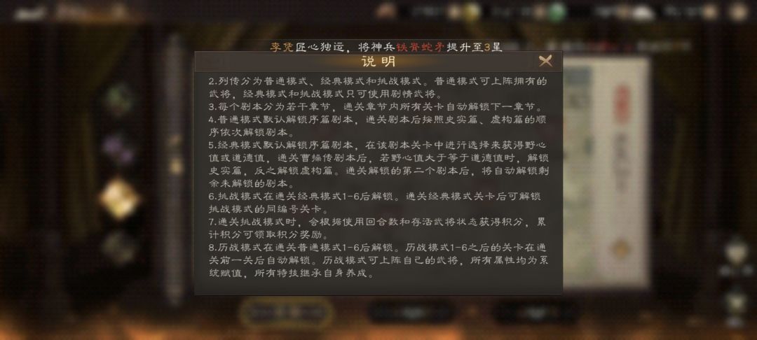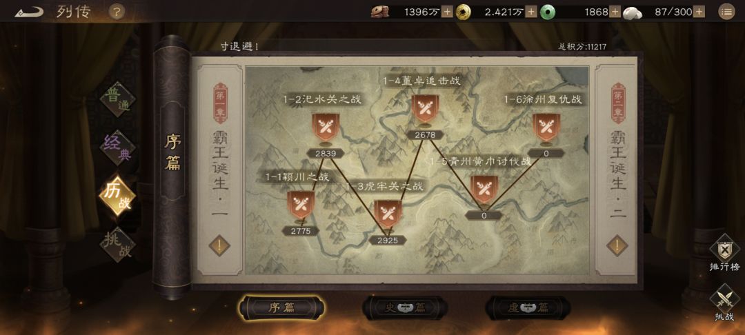 通关普通列传1-6之后就可以解锁历战列传,该模式可以上阵任意自己拥有的武将,但是要注意