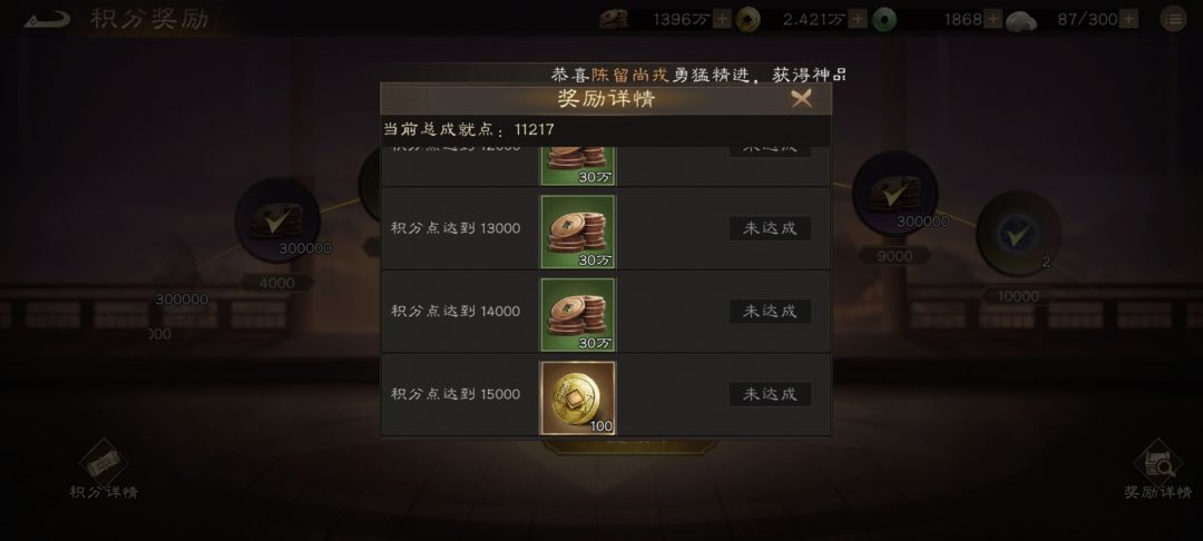 该玩法产出大量铜钱,基本顺序就是每三个30万铜钱+100金珠,再每三个30万铜钱+2蓝抽,8项奖励循环,基本上每打一关可以提升两个半档的奖励(我没有鸡脚