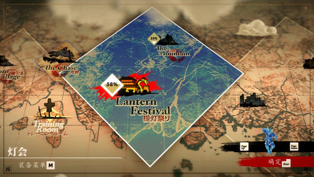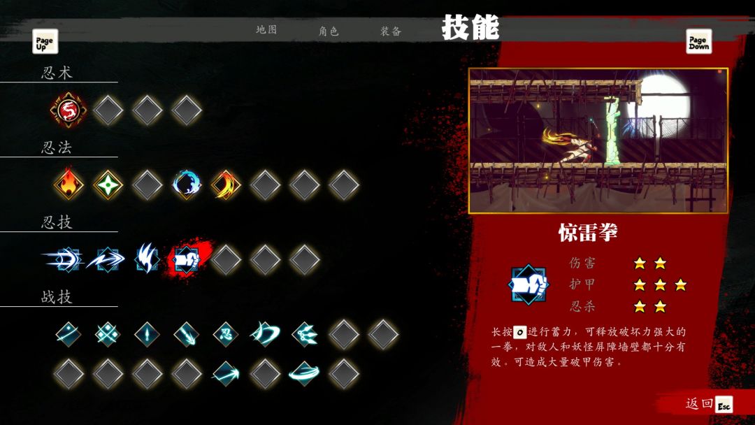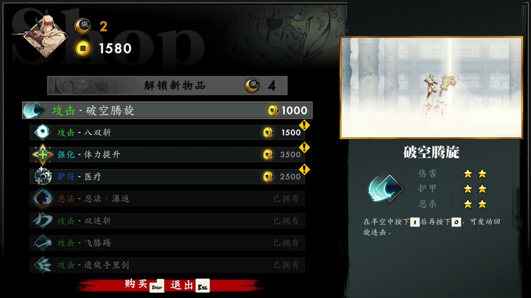 世界地图可以选择不同的关卡地图去重新挑战或是进行收集,关卡中可以随时查看当前关卡的地图去查看哪里没有去,找到一些隐藏的道路和需要收集的秘藏等等,比如找到的胧珠可以在商店解锁新物品进行购买,同样金钱可以在商店购买新的攻击方式,比如战技、双连斩,忍法等等,当然战斗时的视觉表现也十分炫酷,挥刀的音效和轨迹特效,敌人从一团白雾中出现,闪避的残影,连招衔接打出的的不同颜色。