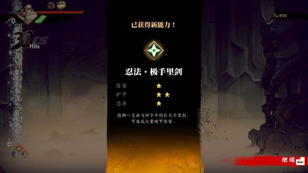 攻击方面基础手段还是手里剑和近战刀术,手里剑有数量限制,近战有着轻攻击与重攻击区别,方便打出连招,游戏中称为战技,比如忍杀,攻击可以充能忍杀槽,在敌人头顶出现标记时可以进入架势,发动忍杀能够对当前标记的敌人都给予致命一击,游戏中忍杀有额外奖励而且敌人数量越多奖励越多,你甚至可以通过留下头顶有标记的敌人,让当前屏幕敌人头顶都有标记后发动来得到更多金钱。