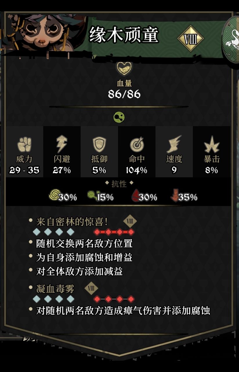 顽童有着高额的闪避和不俗的速度,能将腐蚀转化为滋养,9速让顽童容易开局乱位