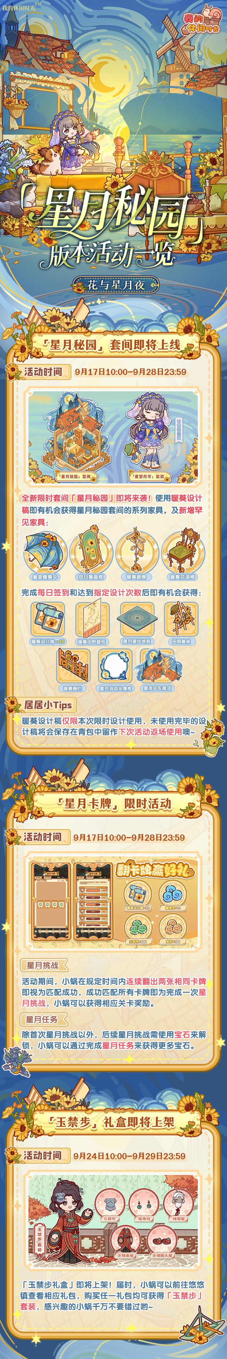 💫全新限时套间「星月秘园」即将上线!届时小蜗可以在「设计空间」-「星月秘园」获取相应家具及摆件,完成每日签到还可领取暖葵设计稿*5等奖励,在漩涡翻涌的星月夜下,枕着满室花香安眠吧~