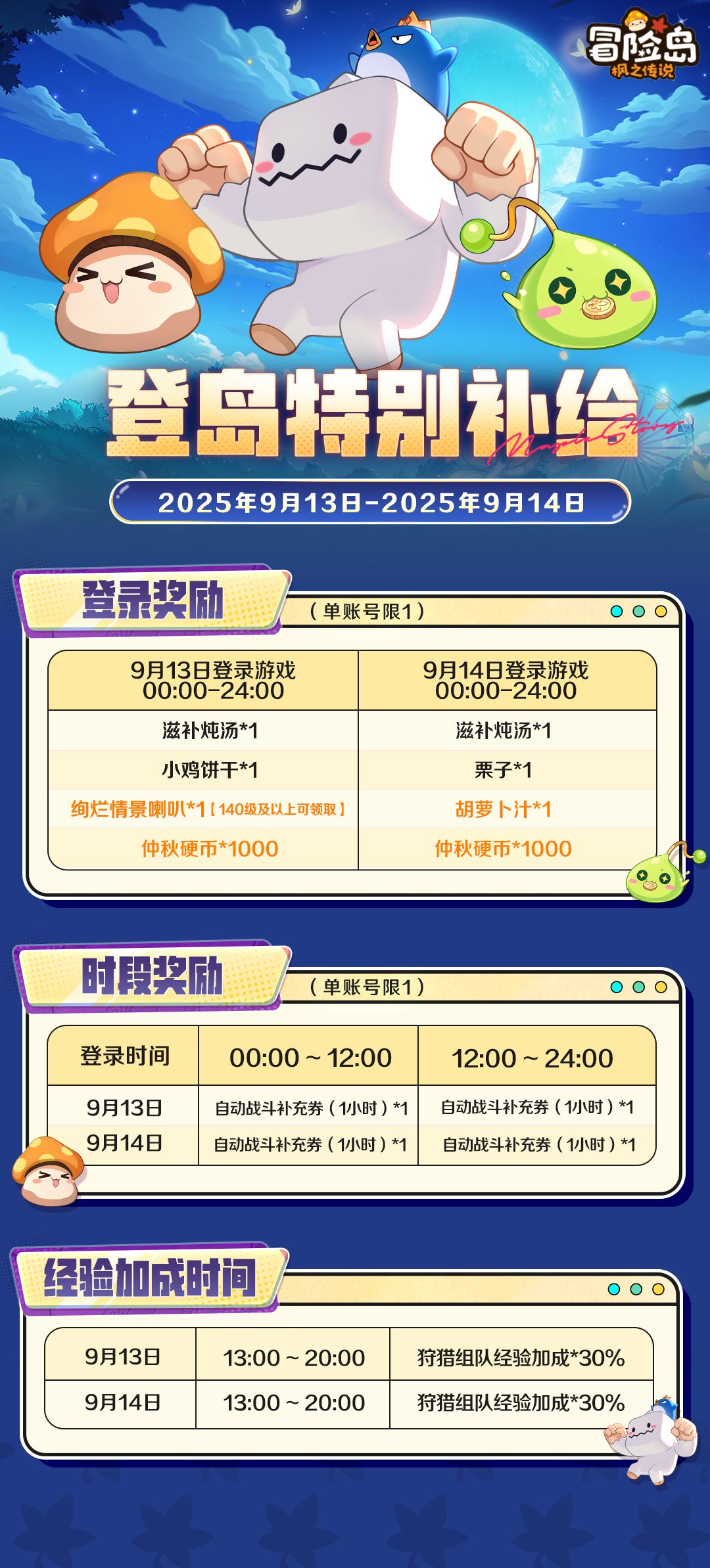 9月13日~9月14日 13:00~20:00:狩猎组队经验加成*30%