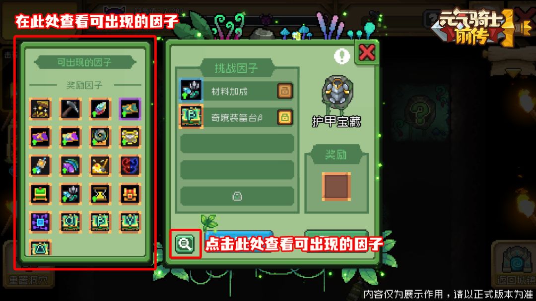 斗技场因子将在较高难度的秘藏挖掘关卡出现,小骑士可以点击因子界面左下方的放大镜按钮,查看当前可刷新出的因子种类。