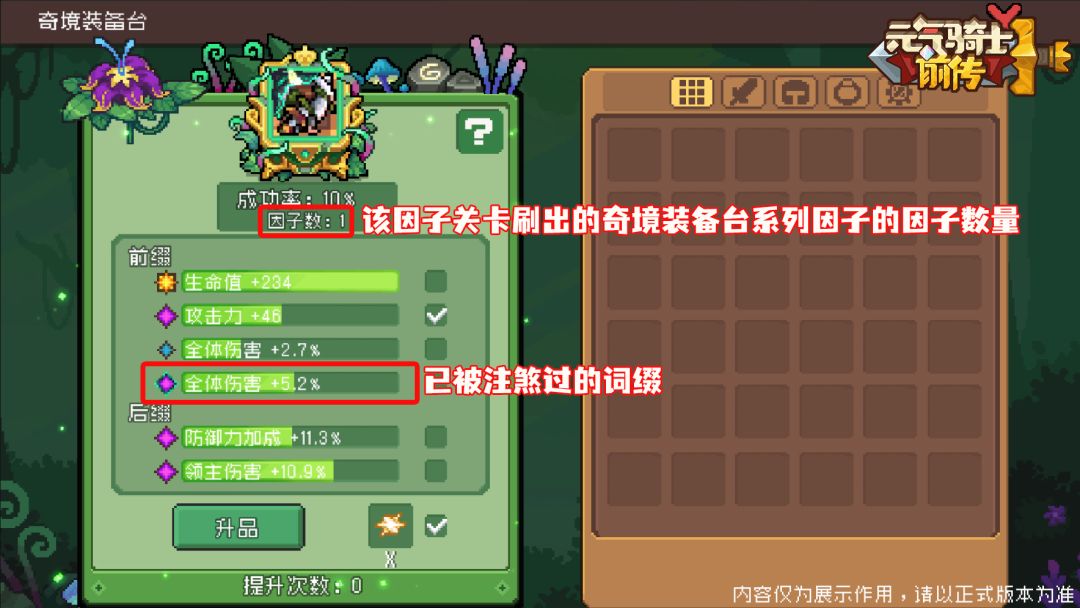每个奇境装备台有一定的提升次数,提升次数用完后将无法提升装备的词缀品质,建议小骑士刷出较多的奇境装备台系列因子,并搭配“神化石”,提高升品的成功概率!