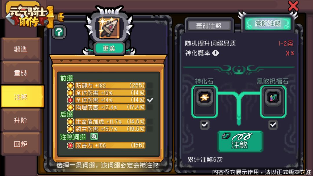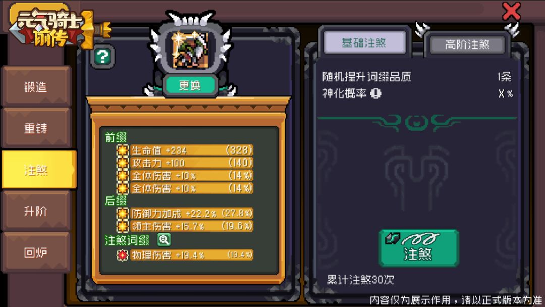 小骑士可通过【右上角主菜单】-【铁匠】-【注煞】处体验,或在装备详情中点击【熔铸】后体验。