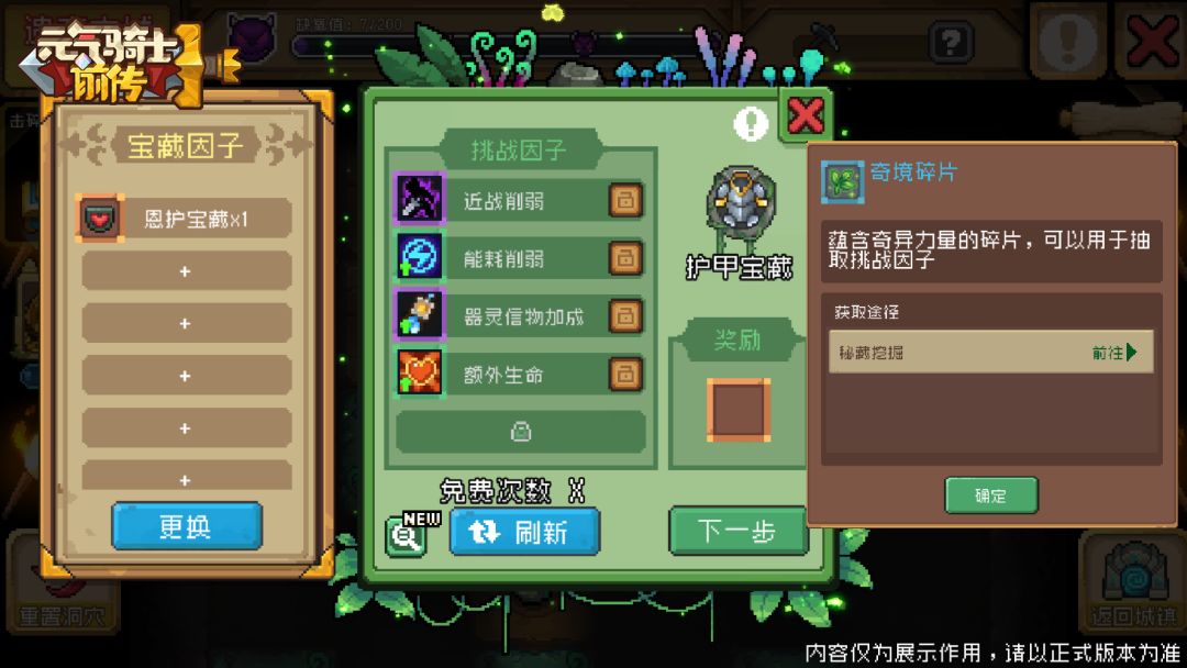 小骑士在进入因子关卡前,可以在因子界面处锁定或刷新因子。每个因子界面均有免费的刷新次数,在免费次数用完后,小骑士可以使用“奇境碎片”刷新挑战因子。“奇境碎片”可以通过挖掘其他普通砖块获得。
