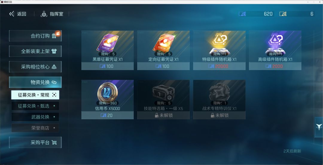 可兑换征募凭证、SSR插件自选箱等;前往采购平台→物资兑换→征募兑换-甄选 进行兑换