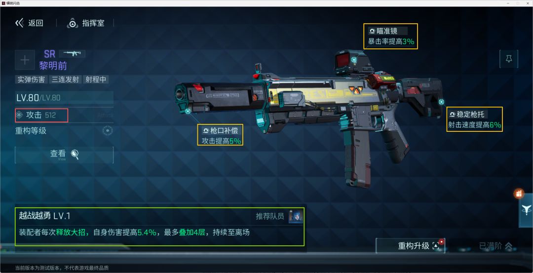 - 配件效果(黄色框):随枪种和品阶变化,可提升暴击率、射速、攻击距离、弹夹容量等关键属性,品阶越高,可激活的配件种类越多;