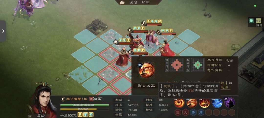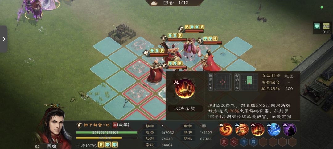 3. 火烧赤壁(大招):超大范围(5×3格)火系伤害(系数170%),释放后直接结算所有目标1回合持续效果;若范围内仅1名敌军,额外结算该目标3回合全部负面效果,且结算后负面效果不清除,爆发与持续伤害拉满,强度极高。