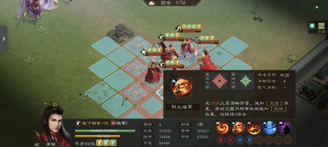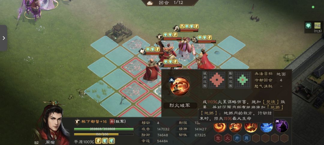 1. 烈火破军(技能1):范围型火系谋略伤害(系数110%),命中后给目标挂「焚烧」,同时对范围内所有地块附加「地燃」效果,持续3回合,是核心的大范围上debuff技能。