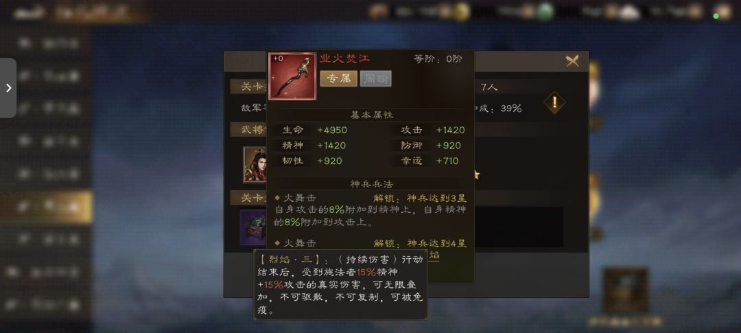 - 核心被动(水火并济):谋略伤害+20%、暴击抗性+40%、生命上限+15%;自身谋略伤害无视地形衰减,造成伤害后给目标施加「烈焰二」(持续伤害,行动结束后受施法者12%攻+精的真实伤害)。