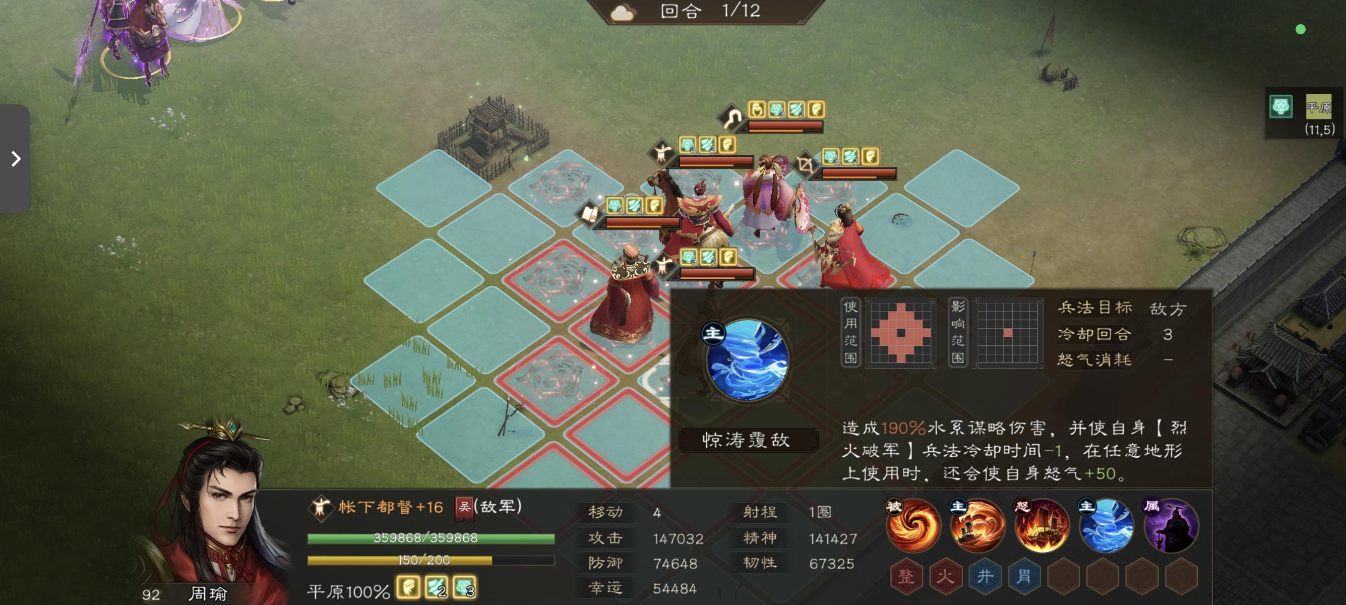 2. 惊涛覆敌(技能2):单体水系伤害(系数190%),核心功能为减少「烈火破军」1回合冷却,并为自身回复50点怒气,怒气循环能力极强。