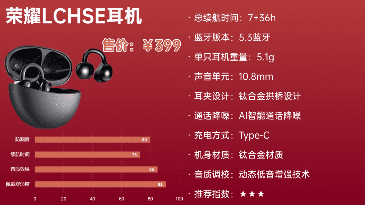 搭载定制动圈单元,中高频清晰通透,人声辨识度高,适合追剧和通话。低频表现中规中矩,力度稍显不足,声场偏窄,复杂音乐场景下层次感一般,整体听感偏向日常轻度听音。单只耳机续航约10小时,充电盒可提供额外30小时续航,总续航达40小时,支持快充和无线充电,充电方式灵活。Type-C充电接口兼容性强,日常充电方便,续航表现中规中矩。推荐五:荣 耀LCH SE耳机参考价:¥399