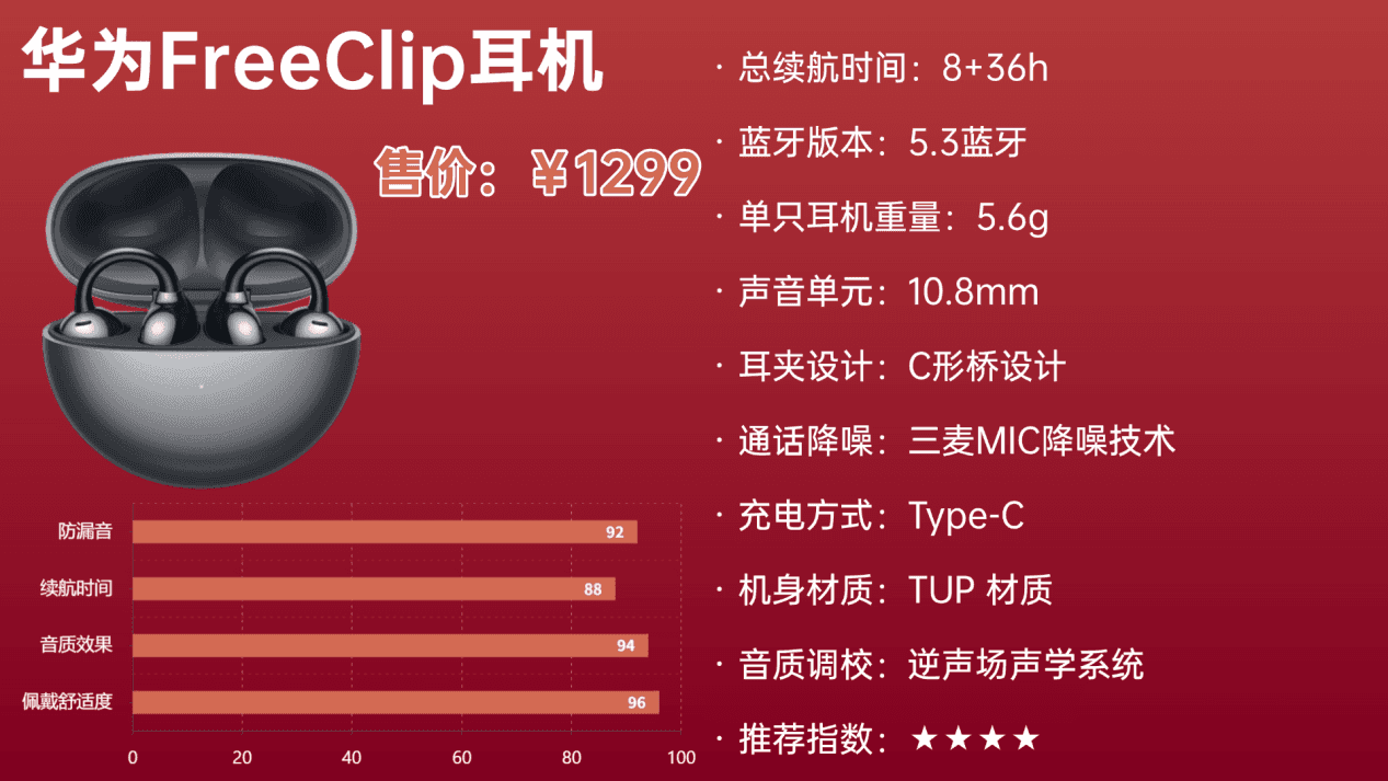 南卡虽专注于开放式耳机领域,却始终将产品品质与用户体验放在核心位置,不少用户都评价它是“百元价位耳夹式耳机中,音质和舒适度表现最为突出的一款”。具体到南卡Clip Pro这款产品,其在选材与生产环节更是毫不含糊,选用的材料成本与涉及的工艺难度均高于常规产品,且全程按照严苛标准进行制造,每个生产环节都会淘汰30%的产品,只留下品质达标的精品,这般专业的品控实力也得到了市场与消费者的广泛认可。推荐二:华 为 Free Clip耳机参考价格:¥1299