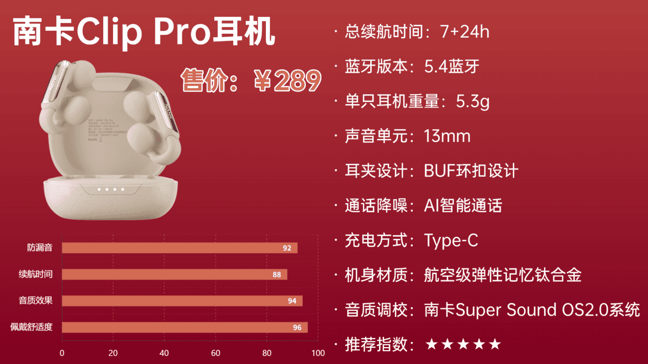 从硬件来看,南卡Clip Pro的声学配置完全能对标高端机型,它搭载了自研的MCW多层复合宽环振膜、Super Sound OS 2.0发烧级声学系统以及Omni-SSA声场引擎,这些技术的融合让听歌体验大幅提升:声音饱满紧实,低音浑厚有力,声场开阔通透,整体音质表现可与千元大牌相媲美,还获得了不少数码博主和专业测评机构的认可,被评为高性价比耳夹式耳机。