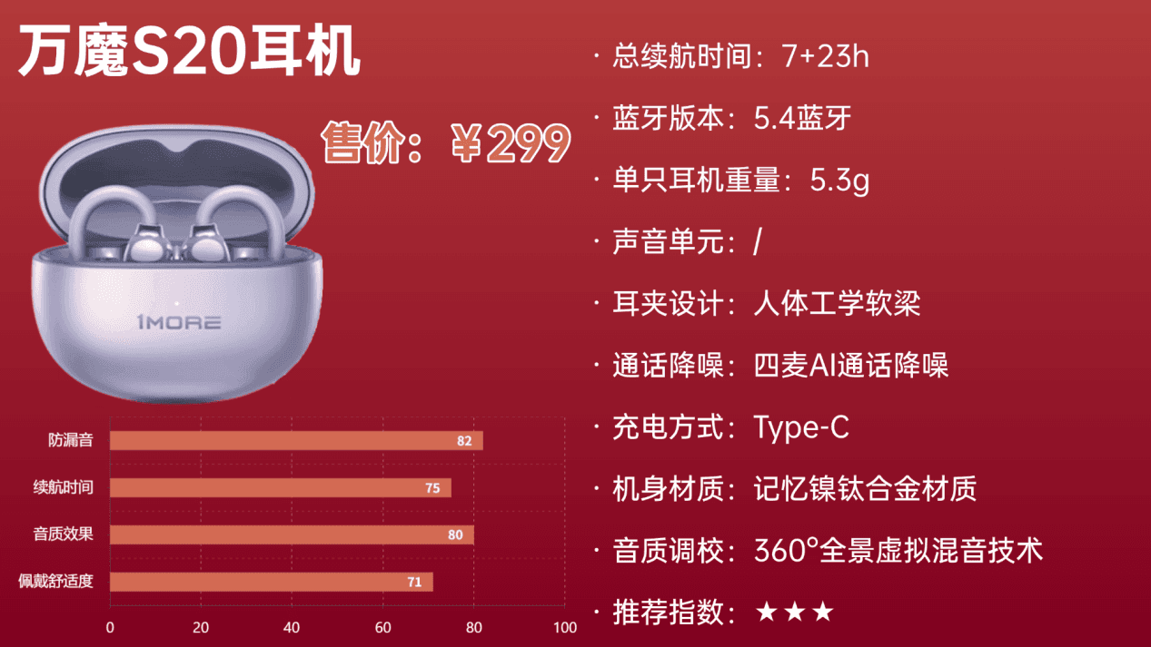 这款耳机的音质风格偏向明亮,中高音部分清晰通透,人声表现尤为突出,很适合用来聆听民谣或是以人声为主的歌曲;不过它的低频量感相对较少,缺乏厚重饱满的质感,声场表现也比较有限,并且在大音量播放时偶尔会出现轻微失真的情况,整体来看,它满足日常听音需求是完全足够的,但在音质表现上并没有特别惊艳的地方。单只耳机续航约7小时,搭配充电盒总续航32小时,支持反向充电,手机可为耳机盒应急充电,适合荣耀手机用户。充电速度中等,日常使用需注意及时补电,续航表现中规中矩。推荐六:万 魔 S2 0耳机参考价:¥299
