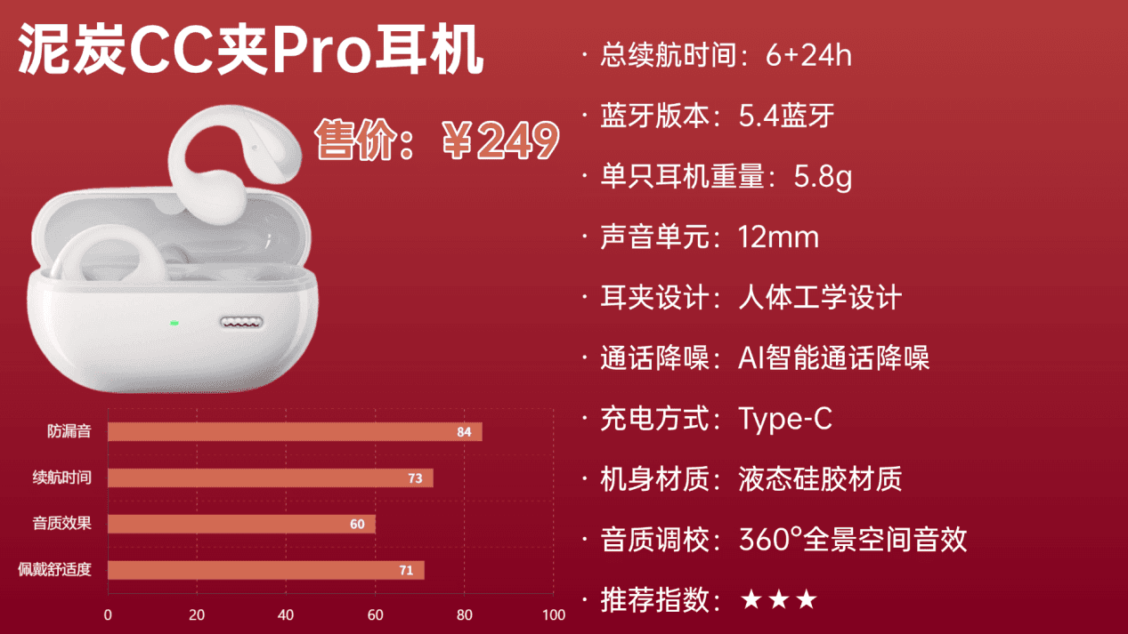 这款耳机的调音比较均衡,低、中、高三频表现都很平稳,人声听起来自然舒服,低频不会有拖沓的感觉,高频也不刺耳,声场表现也在适中范围。平时通勤时用来听音乐、接电话都很合适,虽然没有特别突出的亮点,但也没有明显的短板,音质表现中规中矩,完全能满足日常基础的听音需求。这款耳机单只续航约7小时,搭配充电盒使用总续航可达21小时,还支持Type-C快充接口,充电速度表现不错;这样的续航能力完全能满足日常使用需求,不用频繁为耳机充电,即便对于使用频率不高的轻度用户来说,其续航表现也足够让人满意。推荐八:泥 炭 CC 夹P ro耳机参考价:¥2299
