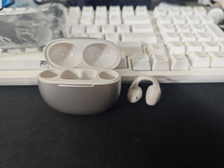 整体机身重量5.8g,采用金属喷砂工艺,质感较好但佩戴时与耳朵的贴合度欠佳,耳夹角度设计较为固定。日常行走时不易掉落,但跑步或头部大幅活动时容易滑落,长时间佩戴后耳廓可能有轻微压痕,稳固性有待提升。