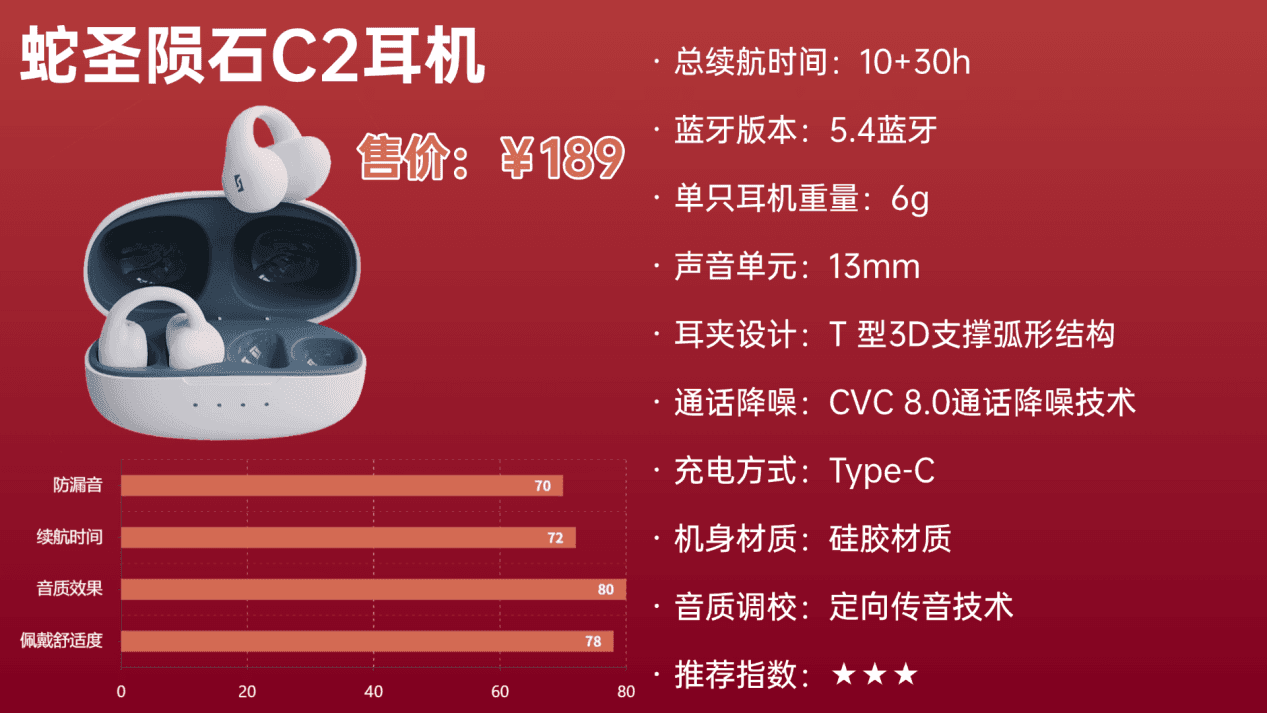 这款耳机在音质上更侧重清晰质感与穿透效果,低频表现适中,能在运动过程中为用户提供充足的节奏感,中高频部分的表现也十分稳定,人声与背景音的分离度做得不错,非常适合运动时佩戴使用;不过它的音质细腻程度相较于专业音乐耳机还有差距,整体听感更偏向实用属性,用来满足运动时的听音需求则完全没有问题。单只耳机续航约5小时,充电盒总续航28小时,充电盒带有电量显示屏,能直观查看剩余电量。支持Type-C充电,充电速度较快,续航表现满足运动或日常使用需求,外出时无需频繁充电。推荐十:蛇 圣 陨 石C2耳机参考价:¥189