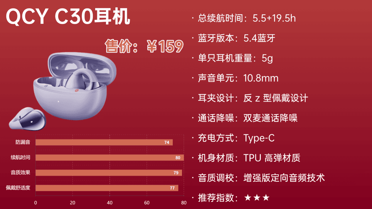 采用复合振膜单元,低频量感较足但略显松散,中高频清晰,人声表现尚可,声场一般。复杂音乐场景下层次不够分明,适合日常听流行音乐或有声书,整体音质表现符合其价格定位,没有特别惊艳之处。单只耳机续航约8小时,充电盒总续航达32小时,支持无线充电和快充,充电方式灵活。续航能力在同价位产品中表现较好,满足长时间外出使用需求,无需频繁充电。推荐九:Q C Y C3 0耳机参考价:¥159