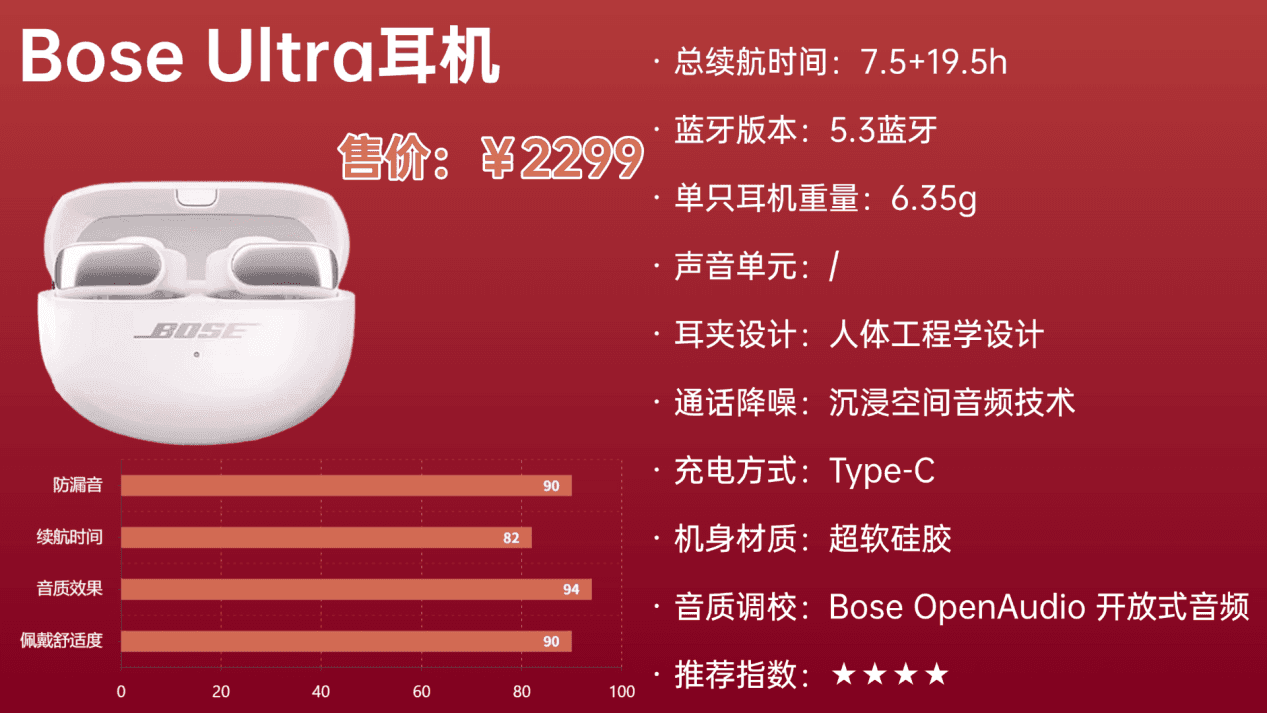 调音偏向均衡自然,人声清晰通透,中高频表现稳定,能满足日常听流行音乐、追剧的需求。低频有一定节奏感但下潜较浅,声场开阔度一般,整体风格偏向实用,没有明显短板。单只耳机续航约8小时,搭配充电盒总续航可达32小时,支持快充功能,充电10分钟就能使用1小时,日常通勤或短途出行无需频繁充电,续航表现满足多数用户的日常需求。推荐三:Bo se Ult ra耳机参考价:¥2299