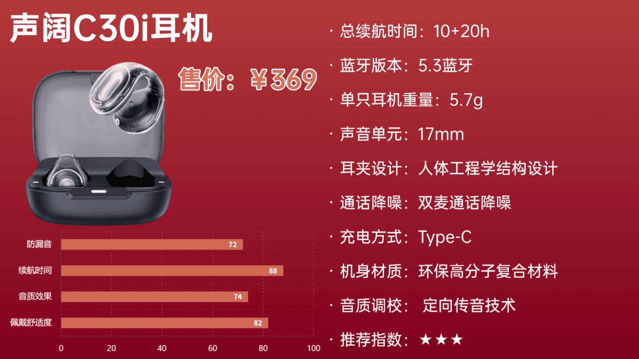 这款耳机延续了Bose品牌一贯出众的声学优势,音色表现醇厚饱满,低频部分浑厚且富有弹性,中高频则能清晰呈现丰富细节,整体声场开阔通透;无论是人声的细腻质感还是乐器声的层次,都有着较高的还原度,尤其在聆听古典乐或是电影原声时,能带来极强的沉浸体验,非常适合对音质有一定追求的用户选择。单只耳机续航约8小时,充电盒可提供额外24小时续航,总续航达32小时,耳机盒带有电量显示屏,能直观查看剩余电量。支持Type-C充电,充电速度较快,满足长时间外出使用需求。推荐四:声 阔C3 0i耳机参考价:¥369