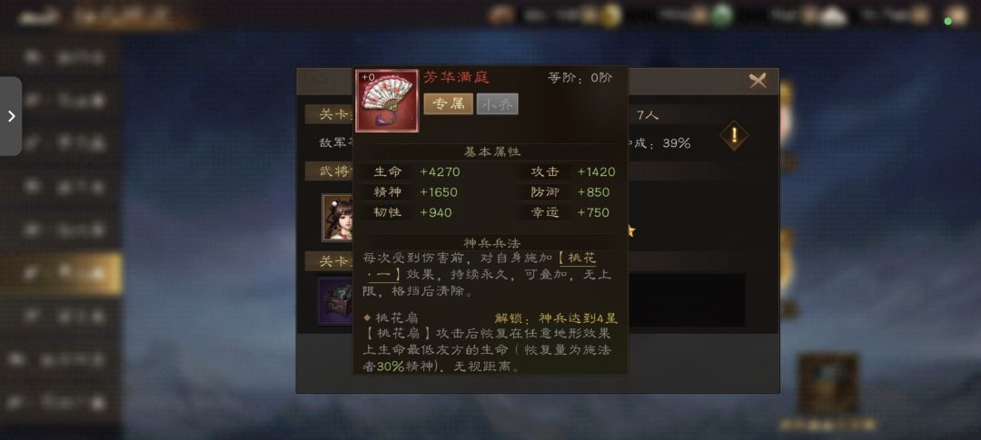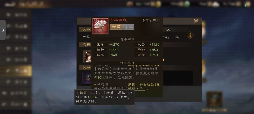 - 5星:“桃花一”升级为“桃花二”,格挡几率+30%且可无限叠加,触发格挡后效果清除。