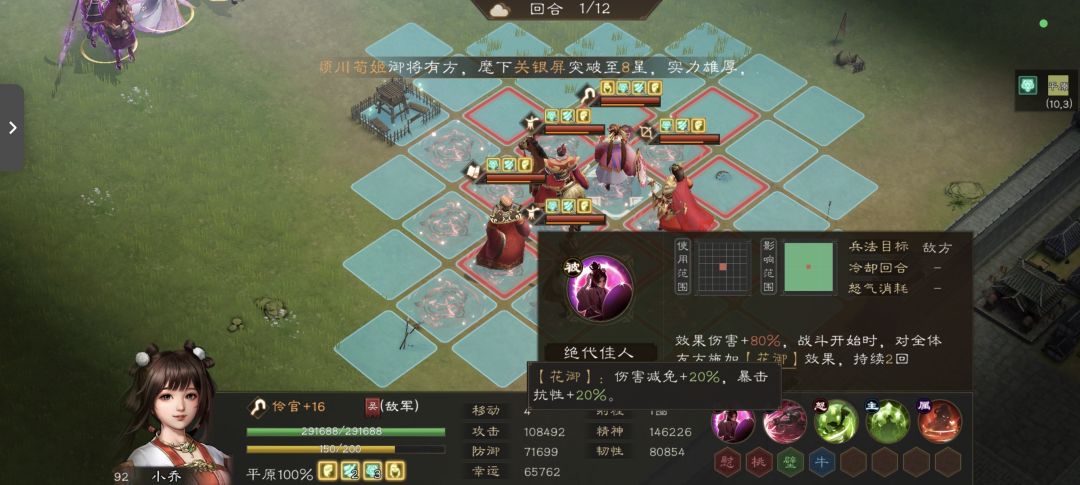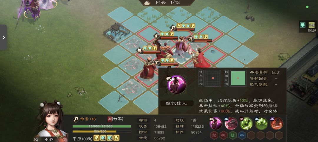 小乔是绝对的T0人权卡。集续航(每回合25%上限回血+范围奶)、多重buff(攻防属性、地块效果延长)、团队减伤(花御、防援二)、持续伤害增伤(敌军持续伤害+80%)于一体,机制全面且强度极高。若按当前属性上线正式服,作为稀有卡绝对值得拉满。