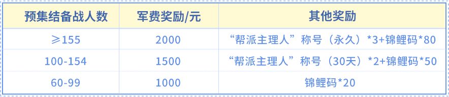 (2)开服集结军费:开服后,官方将根据H5预集结,备战的帮派达成情况以及帮派实际进帮人数,再次帮派发放开服军费奖励!