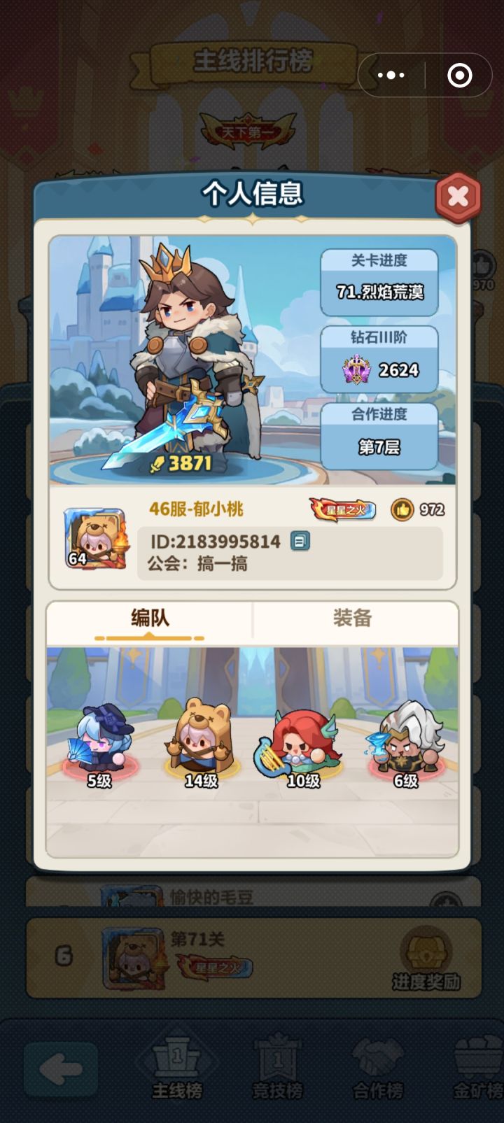 如图,6 级风暴,5 级雪姬,14 级安妮,10 级美人鱼,直接主线冲到了71 关,因为体力问题,钥匙没有往后冲。接下来分钟一下如何用风暴过主线。