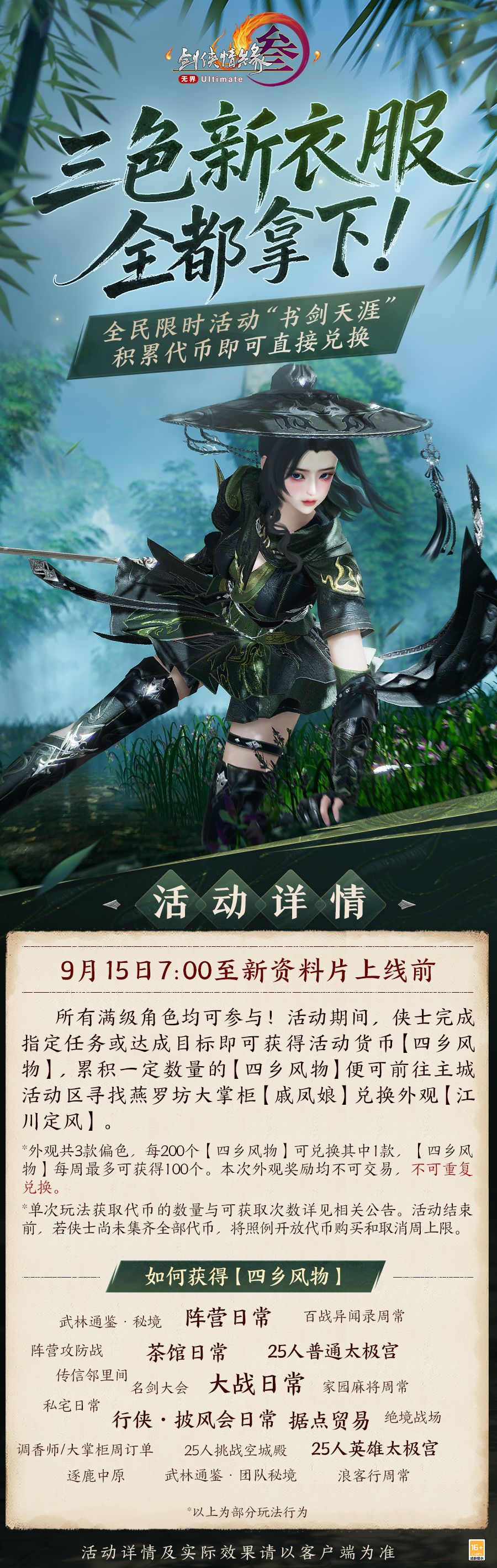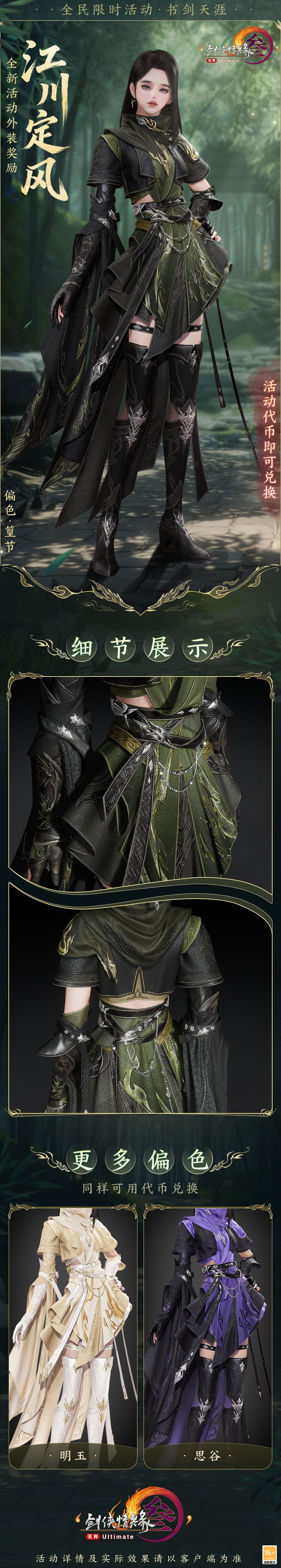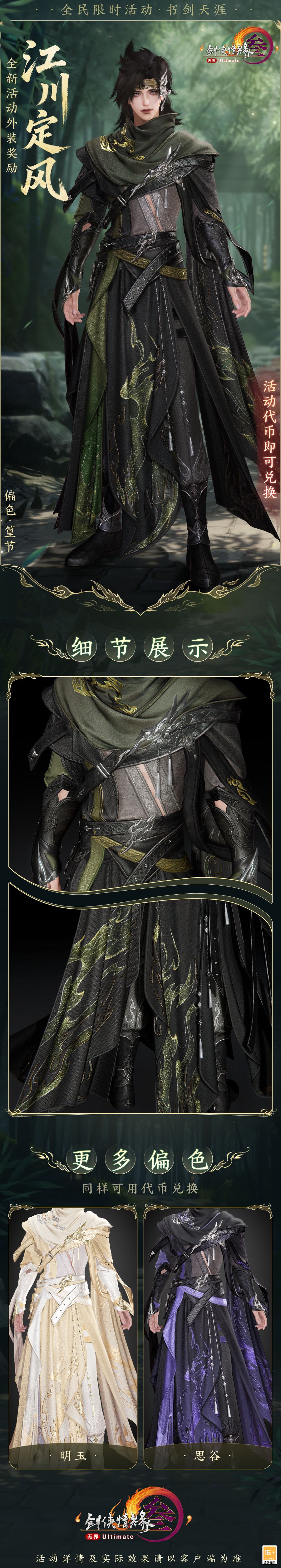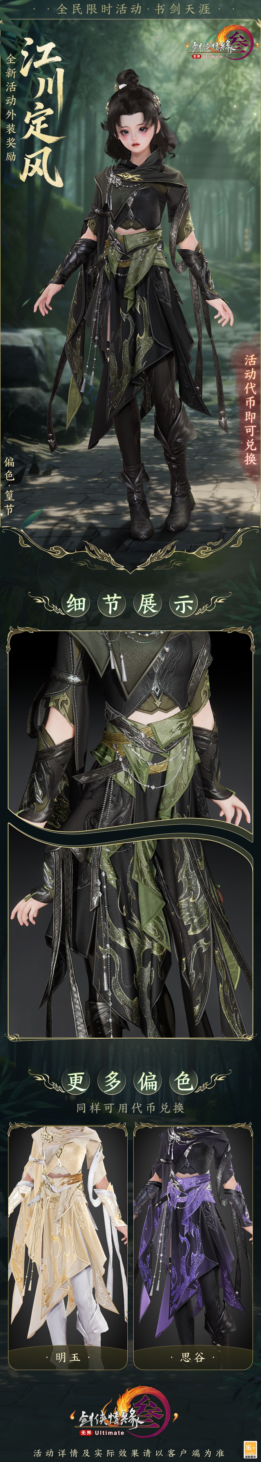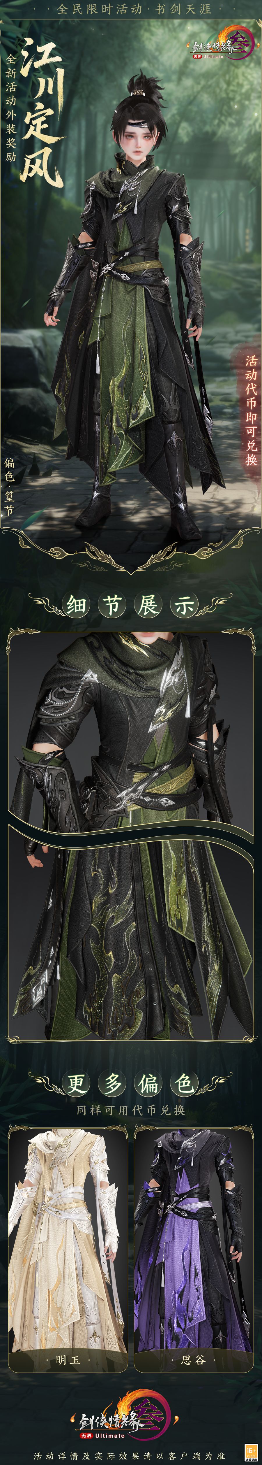 全民活动“书剑天涯”限时开启,全新精美外装奖励“江川定风”9月15日飒然来袭!所有满级角色参与活动积攒代币,可兑换全新精美外装“江川定风”的3款偏色!