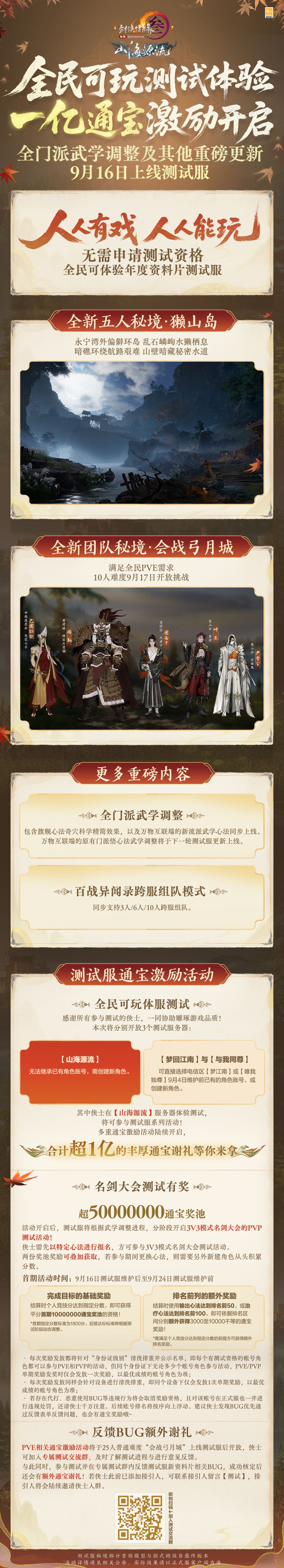 无需申请测试资格,人人都能体验,年度资料片“山海源流”诸多重磅内容将于9月16日亮相测试服!全新五人秘境“獭山岛”、全新团队秘境“会战弓月城”同步登场,还有全门派武学调整与百战异闻录跨服组队模式将上线!
