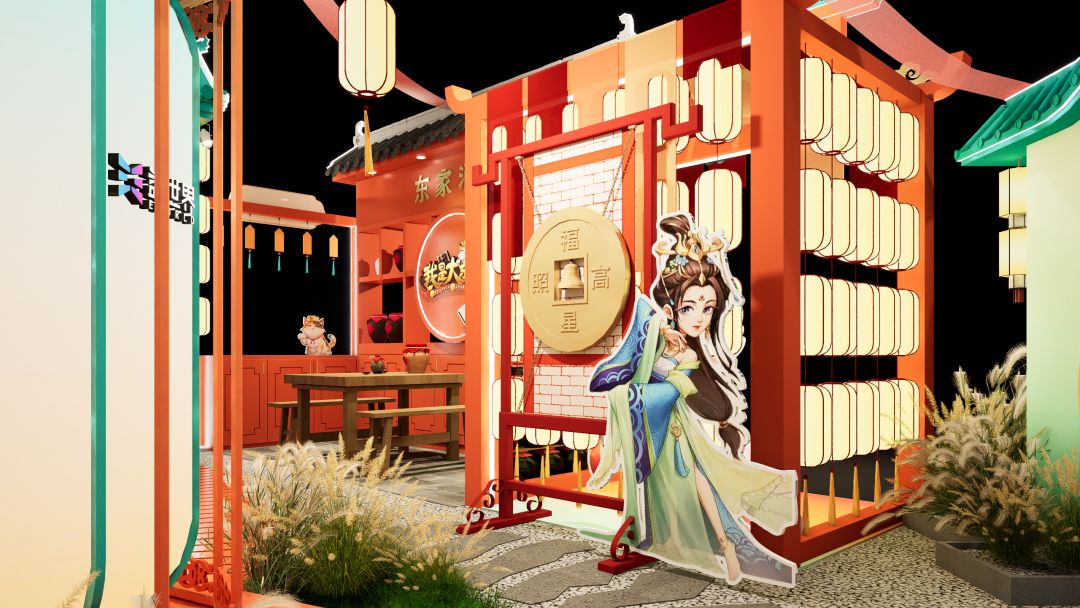 本次展台设计以“益城月下,庙趣共赏”为主题,《我是大东家》区域展现古代市集场景,大家可化身东家经营酒肆,开启一段轻松快乐的经商体验。