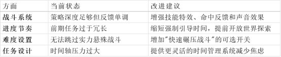 1. 战斗反馈不足:需要增加更多视觉和听觉上的正反馈,提升战斗爽快感。