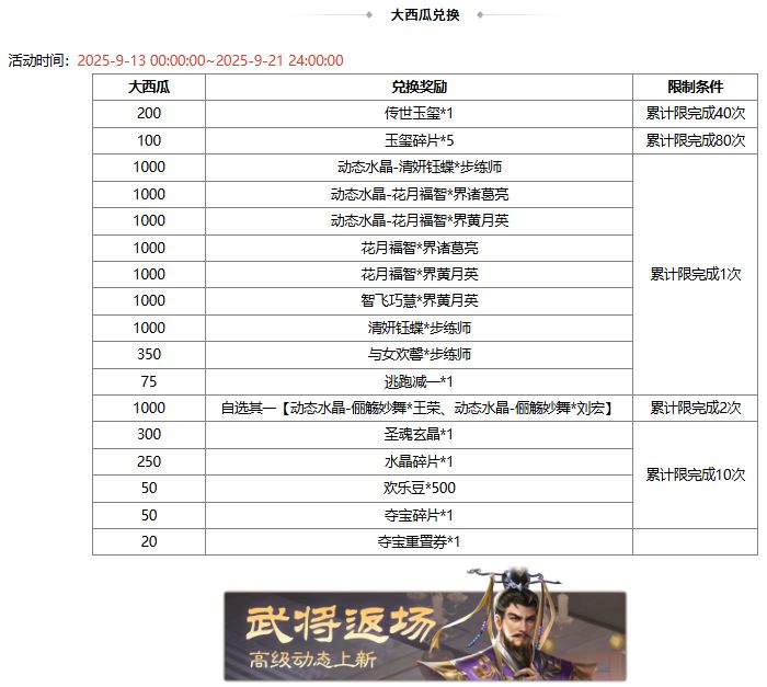 1、大西瓜可兑换奖励,若兑换奖励是在此次活动前已拥有的永久武将、皮肤、三国秀,则无法重复兑换;