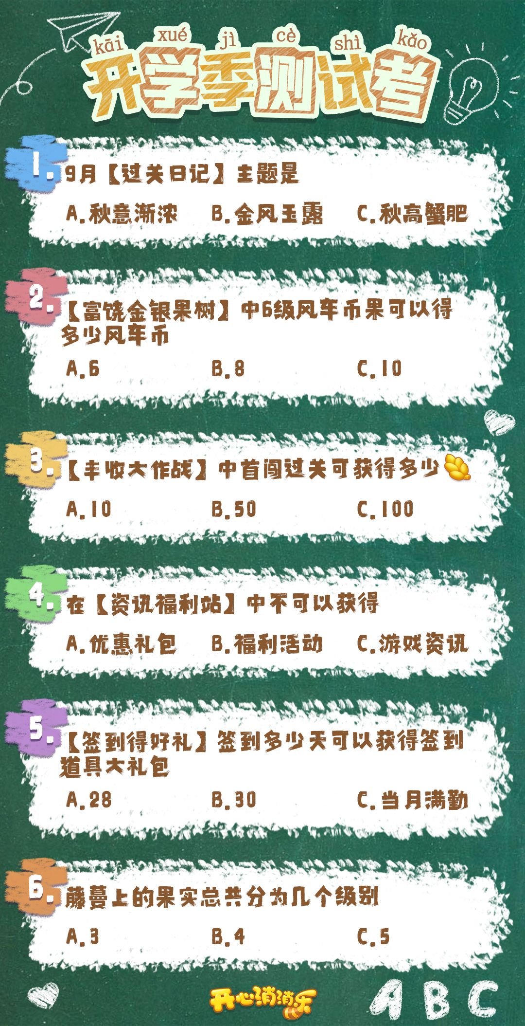 九月开学季!一起来挑战消消乐开学季测试考吧!6道与消消乐玩法相关的考题,正确答案究竟是哪些?相信聪明的小村民一定能够知道正确答案!参与评论分享,赢取道具、周边好礼,挑战满分答卷吧!