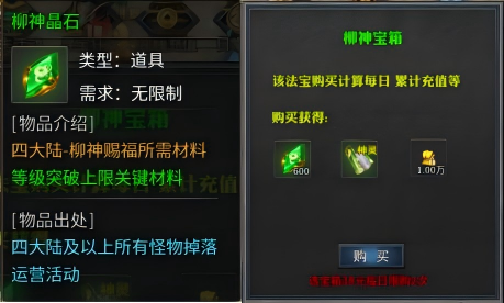 柳神晶石:四大陆及以上区域的怪物均有掉落,参与“柳神宝箱”等日常活动,每日两次获取机会,让你的赐福之路畅通无阻!